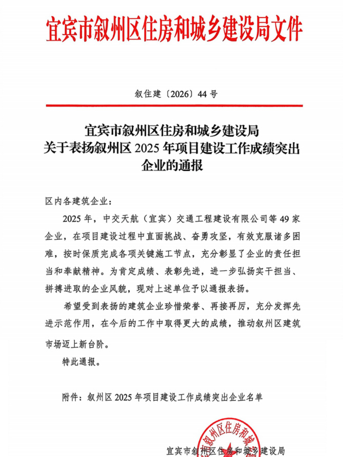 近日,四川明清工程咨询有限公司凭借在宜宾市叙州区 2025 年项目建设中的优异表现,被叙州区住房和城乡建设局授予 “成绩突出企业” 荣誉称号并予以通报表扬。